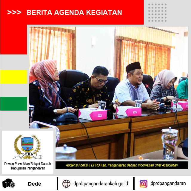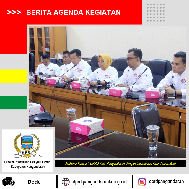 Komisi II DPRD Kabupaten Pangandaran menerima Audiensi dari Indonesian Chef Association Cabang Pangandaran, tujuan dari kegiatan tersebut adalah sosialisasi program kegiatan yang akan dilaksanakan oleh Assosiasi Chef sehinggan nanti kedepannya itu para Chef bisa berkontribusi untuk Kabupaten Pangandaran Khususnya di sektor Pariwisata dan Kulier.